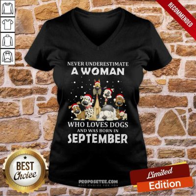 Never Underestimate A Woman Who Loves Dogs And Was Born In September Christmas V-neck-design By Proposetees.com